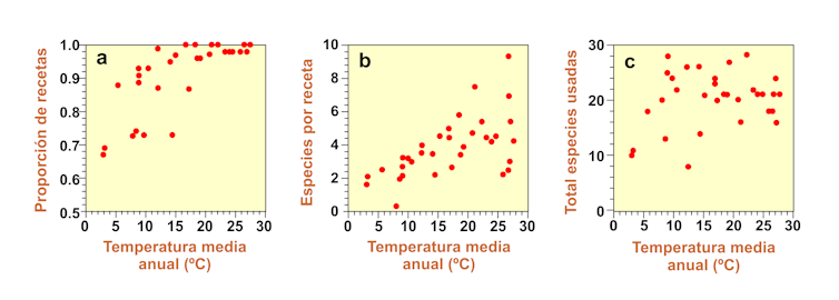 En segundo lugar, el uso de especias debería ser mayor en climas cálidos, donde los alimentos no refrigerados se estropean con especial rapidez. A medida que las temperaturas medias aumentan, hay incrementos significativos en la cantidad media de especias por receta tradicional y en el número de las diferentes especias utilizadas (Figura 2).