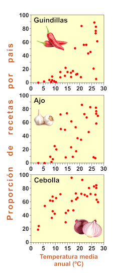 En tercer lugar, las recetas de climas cálidos deberían inhibir una mayor proporción de bacterias que las de climas fríos. Está comprobado que a medida que aumentan las temperaturas anuales, el porcentaje de bacterias inhibidas por las especias en las recetas de cada país aumenta significativamente.