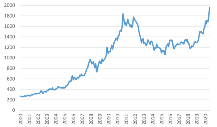 ¿Qué se puede decir del precio del oro? El siguiente gráfico, que muestra el precio de la onza en los últimos veinte años, muestra una clara tendencia alcista, hasta llegar al máximo histórico de 1 981 dólares el 15 de julio de 2020.