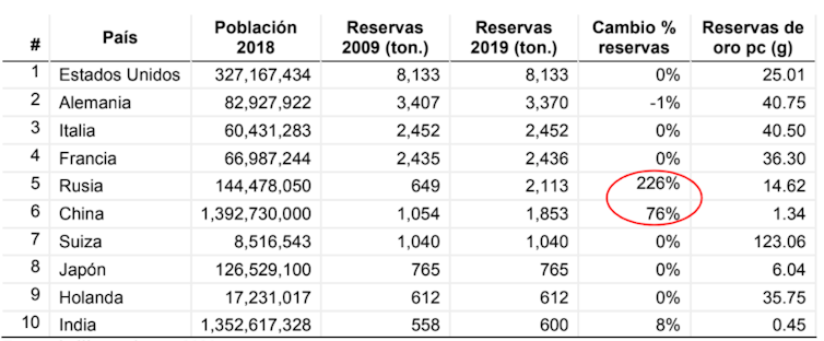 Si bien las reservas de oro en términos per cápita de Rusia y China son todavía modestas (última columna), destaca su crecimiento en los últimos diez años, de un 226% y un 76% respectivamente, en comparación con la inmutabilidad de las reservas del resto de países.