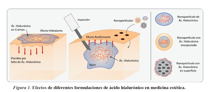 Por tanto, el ácido hialurónico de la mayoría de las cremas antiedad quedará en la superficie, donde aportará hidratación y suavidad, pero no turgencia, para lo cual serían necesarias inyecciones o añadirlo en forma de partículas lo suficientemente pequeñas como para atravesar dichos poros, distinguiendo nanopartículas hechas de este compuesto, las que lo llevan en su superficie y las que lo encapsulan en su interior (Figura 1).