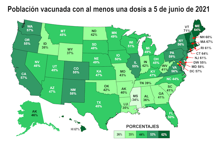 Como ocurre con muchos asuntos que dividen a la sociedad estadounidense, el mapa de estados que manejan buenas cifras de vacunación y el de los que están por debajo de la media nacional se superpone casi a la perfección con el reparto electoral entre demócratas y republicanos, respectivamente. Mientras que en Vermont y Massachusetts el porcentaje de vacunados supera el 60 %, en el sur, en estados como Alabama, Louisiana y Mississippi, la cantidad de personas vacunadas no supera el 35 % (Figura 3).