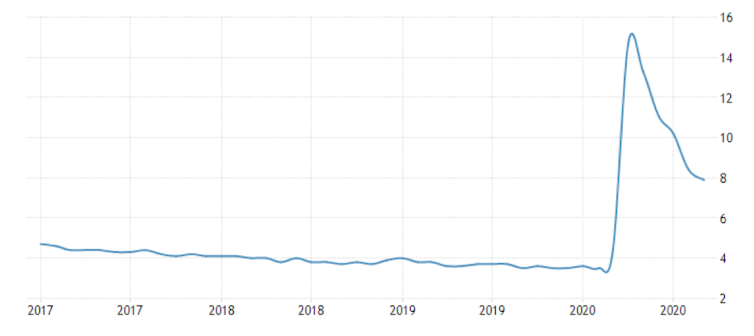 Tasa de paro de EEUU en % (enero 2017-septiembre 2020). Trading Economics