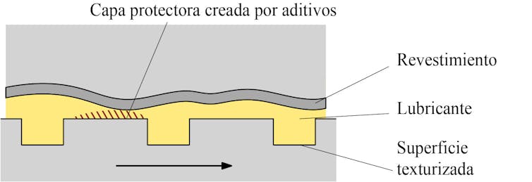 La segunda área de investigación consiste en crear nuevos recubrimientos (especialmente a base de carbono) que protegen las superficies que entran en contacto entre sí y dan lugar a una menor fricción. Otra posibilidad es texturizar las superficies con una red de agujeros, que tienen las dimensiones óptimas para una lubricación más eficaz.