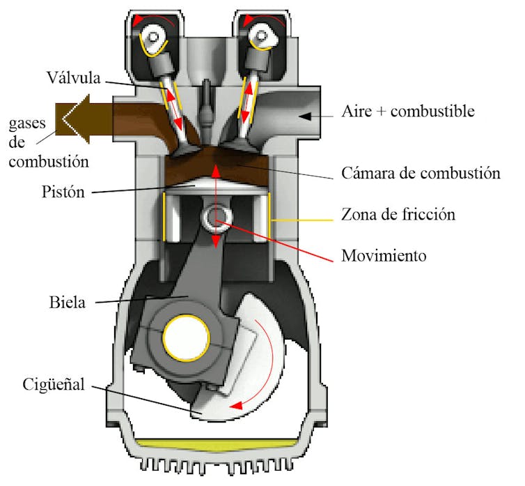 En un motor de combustión, se quema una mezcla de combustible y aire dentro de la cámara de combustión. Esto aumenta el volumen de gas en la cámara y la presión resultante empuja el pistón hacia abajo. El pistón está conectado al cigüeñal mediante una biela, que convierte el movimiento vertical del pistón en un movimiento de rotación. A continuación, esta rotación es transferida por el cigüeñal a la transmisión mecánica (incluida la caja de cambios) y luego a las ruedas.