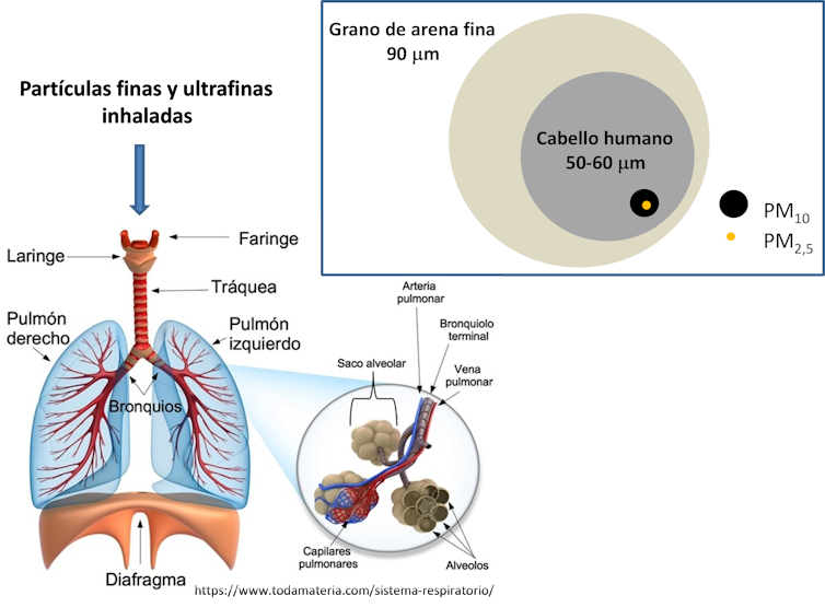 Las partículas finas entran en el sistema respiratorio, pudiendo llegar a los alveolos pulmonares. Estas partículas tienen un diámetro mucho más pequeño que el de un cabello humano o un grano de arena fina. Elaboración propia, Author provided