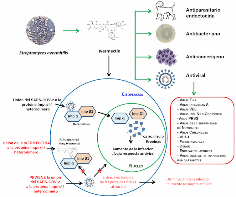 La ivermectina, in vitro, inhibe a las proteínas importinas, cuya función es reconocer señales de localización nuclear de proteínas virales y promover su replicación. Se ha demostrado que el fármaco posee un efecto inhibitorio en el ingreso al núcleo y en la replicación viral de los virus VIH-1, DENV2 y otros flavivirus (Figura).