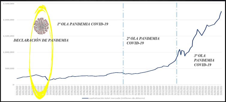 Además, el valor de capitalización de mercado de Bitcoin ha seguido la misma evolución que el mercado de criptodivisas, ya que ha crecido de forma moderada, acelerada y explosiva durante las tres olas del SARS-CoV-2, pasado de un valor cercano a los 150 000 millones de dólares antes de la COVID-19 hasta alcanzar su máximo histórico de 1,2 billones de dólares a mediados de abril de 2021.