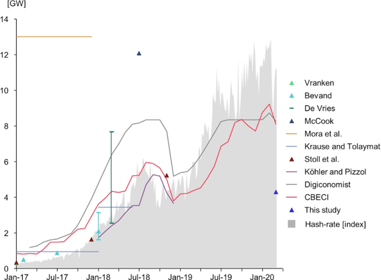 Como se puede ver, el consumo total de potencia estimado en el estudio de Adam Back, uno de los padres de bitcóin, parece bastante conservador. Se sitúa sobre los 4,3 GW. Dado que estas estimaciones incluyen pérdidas de energía en la minería, el consumo real de bitcóin podría ser mayor. Digiconomist, por ejemplo, estimaba 7,9 GW a principios de 2020.