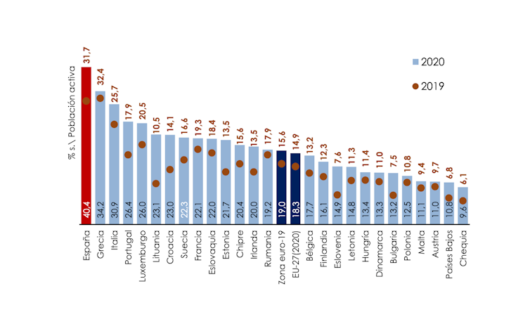 En 2019 España tenía una tasa de paro del 13,7% frente al 7,4% de la media europea. Según diversos estudios, este año podría acabar con unas cifras de desempleo cercanas al 18%, frente al 10% de los países de nuestro entorno. Con esas previsiones se estaría volviendo a niveles de 2010 y 2011, que ya parecían olvidadas y que rondaron el 20%, algo realmente insoportable para cualquier país.