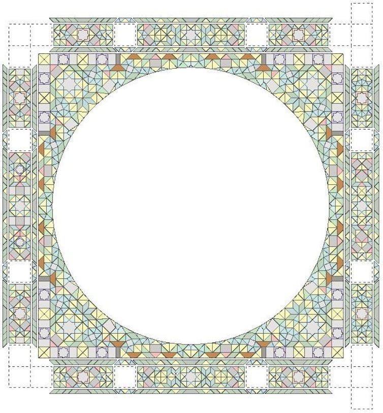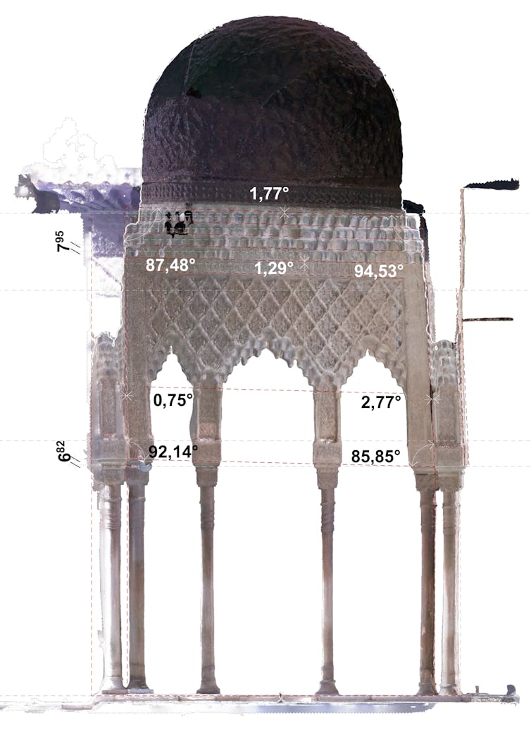 Gracias al escaneado en 3D que hemos realizado se ha podido analizar con precisión métrica su estado actual a partir de la nube de puntos obtenida. Se ha constatado la existencia de piezas deformadas hasta ahora desconocidas. Dichas piezas fueron creadas con gran virtuosismo por los artesanos nazaríes para resolver el difícil encuentro geométrico de las hileras superiores de las pechinas con la base de la semiesfera. Ese tipo de deformaciones se analizó en un artículo previo de los propios autores sobre las pechinas de la Sala de la Barca en la Alhambra.