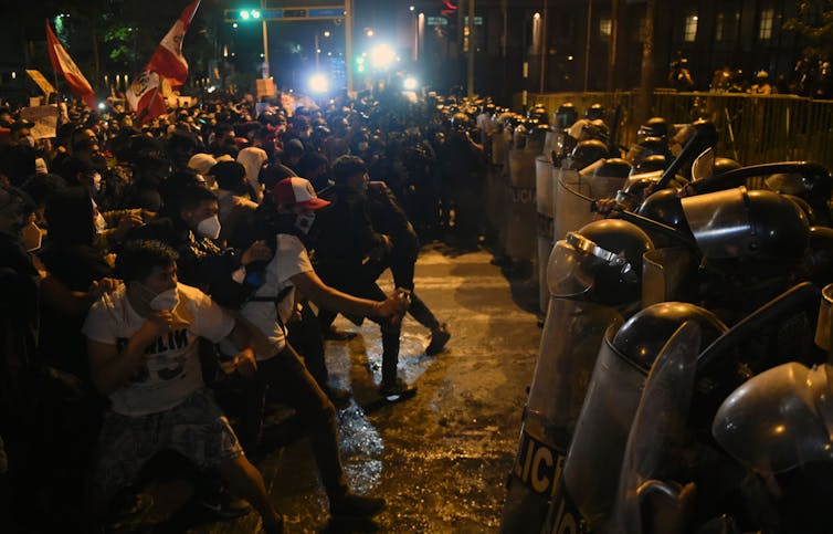La policía antidisturbios se enfrenta a los manifestantes en Lima, Perú, el 12 de noviembre de 2020. Ernesto Benavides/AFP via Getty Images