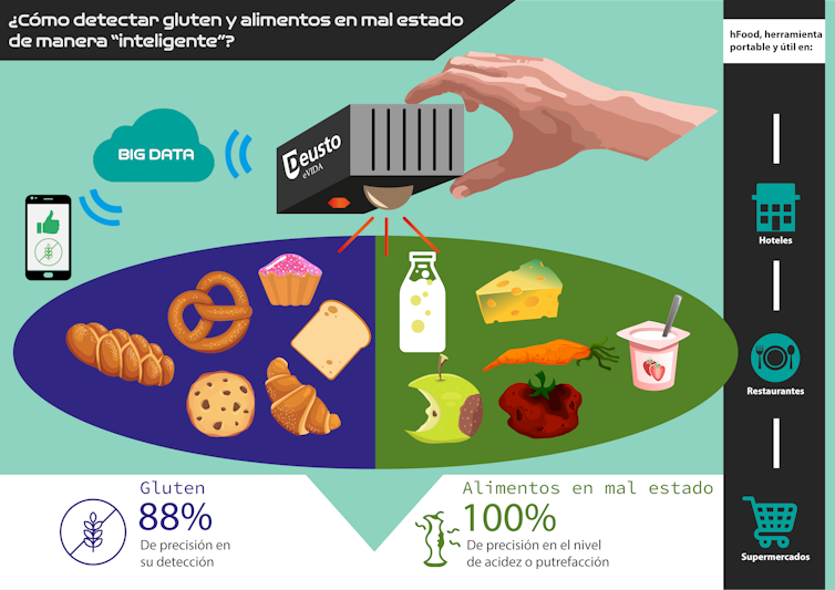 Además, hFOOD presenta una solución tecnológica capaz de analizar la “huella dactilar” de los alimentos utilizando los valores de absorbancia, reflectancia y señal de muestra. ¿Cómo? Utilizando un algoritmo de inteligencia artificial. Este es capaz de detectar tanto alimentos con menos de 20 ppm de gluten como productos en malas condiciones.