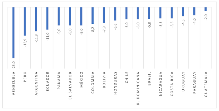 Aunque hablemos en su conjunto de América Latina, las diferencias entre países son muy elevadas. Perú, Argentina, Ecuador, Panamá, El Salvador, México y Colombia han sido los países más afectados. Por el contrario, Paraguay, Uruguay y, especialmente, Guatemala se han visto afectadas en un grado semejante al de otras economías en desarrollo y emergentes. Venezuela es el país que ha registrado una mayor caída de su producción, como en años anteriores, si bien esto no se puede achacar solo al impacto del virus.