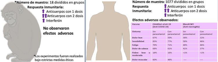 Recientemente se han publicado los resultados de los primeros estudios en humanos (fases I y II). En los ensayos, se inyectó a 543 personas sanas (18 a 55 años) la vacuna contra SARS-CoV-2, y a 534 personas una vacuna diferente (meningococo, que produce otra enfermedad). ¿Por qué meningococo? Porque comparar resultados con algo conocido y de probada eficacia proporciona una información muy valiosa para testar tratamientos nuevos.