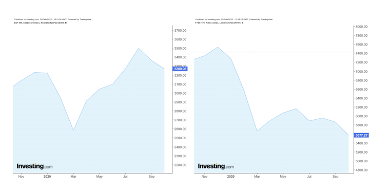 Evolución de los índices FTSE (Reino Unido) y S&P500 (Estados Unidos) entre noviembre de 2019 y septiembre de 2020. Fuente: Investing.com