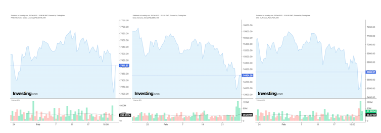 Evolución de los índices FTSE (Reino Unido), DAX (Alemania) y CAC40 (Francia) y volumen de contratación entre el 24 de enero y el 25 de febrero de 2022. Fuente: Investing.com