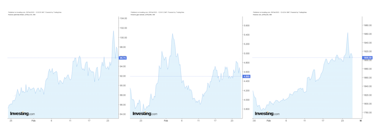 Evolución de los futuros de petróleo Brent, gas natural y oro entre el 25 de enero y el 25 de febrero de 2022. Fuente: Investing.com