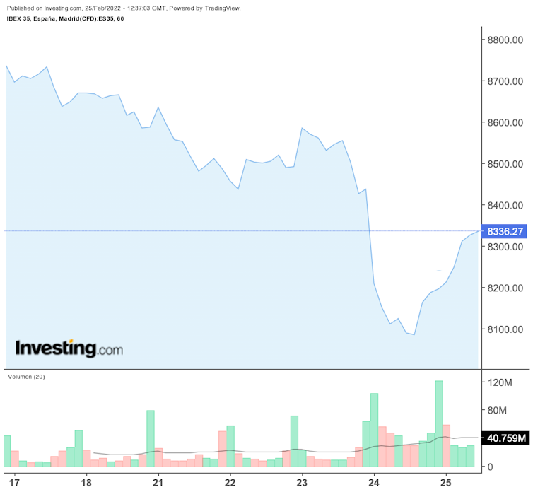 Evolución del IBEX35 (España) y volumen de contratación entre el 18 y el 25 de febrero de 2022. Fuente: Investing.com