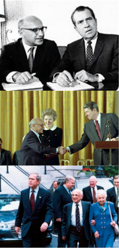 Milton Friedman con tres presidentes de Estados Unidos: Richard Nixon, Ronald Reagan y George W. Bush. Wikimedia Commons, CC BY