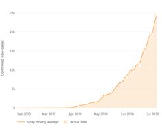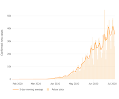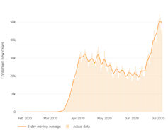 Estados Unidos, que parecía ir doblegando lentamente la curva de contagios durante el mes de mayo y principios de junio (de 32 000 casos diarios a principios de mayo a 21 000 a primeros de junio), experimentó un nuevo y rápido repunte en junio y supera los 45 000 casos diarios en los últimos días.