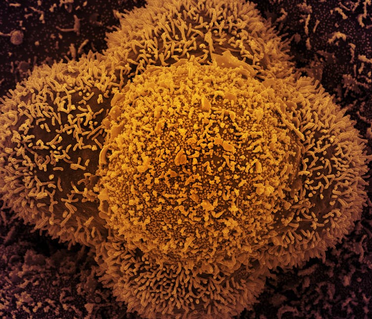 Células CCL-81 (células Vero utilizadas en investigación) fuertemente infectadas con partículas del virus SARS-CoV-2. NIAID / Flickr, CC BY-SA