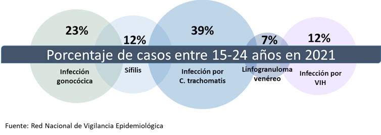 Los jóvenes de entre 15 y 24 suponen el 10 % de la población española, pero la incidencia de las ITS en esta franja de edad supera con creces esa representación. Así, el porcentaje de casos alcanzó el 39,1 % de todos los notificados de infección por Chlamydia trachomatis; el 23 % de los casos de gonococia; el 12% de los de sífilis e infección por VIH, respectivamente; y el 7,4 % de los de linfogranuloma.