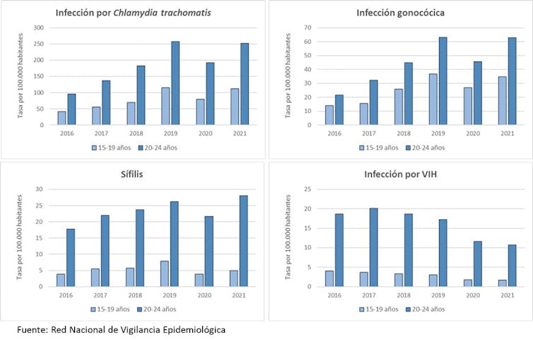 En el periodo de 2016 a 2021 se observa un claro incremento en la incidencia de la infección por Chlamydia trachomatis, gonococia y sífilis. No ocurre lo mismo con la infección por el VIH, tanto entre adolescentes de 15 a 19 años como en jóvenes de 20 a 24 años. Todas las infecciones registraron un descenso en 2020, atribuible a la pandemia de covid-19.