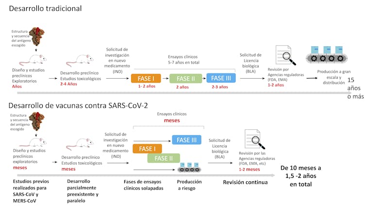 El desarrollo de vacunas tradicionales puede llevar 15 años o más. Como se indica en la figura, se comienza con una fase de descubrimiento prolongada en el tiempo que implica el diseño y realización de experimentos exploratorios.