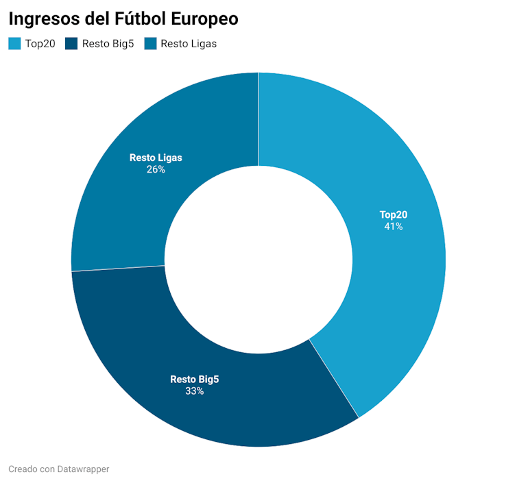 Los 20 mayores clubes controlan el 41% del total de ingresos en Europa. Y todos pertenecen a las cinco grandes ligas (España, Inglaterra, Francia, Italia y Alemania). Los 78 equipos restantes de esas grandes ligas se reparten un 33%, mientras que los más de 3 000 equipos del resto de competiciones apenas logran un 26%.
