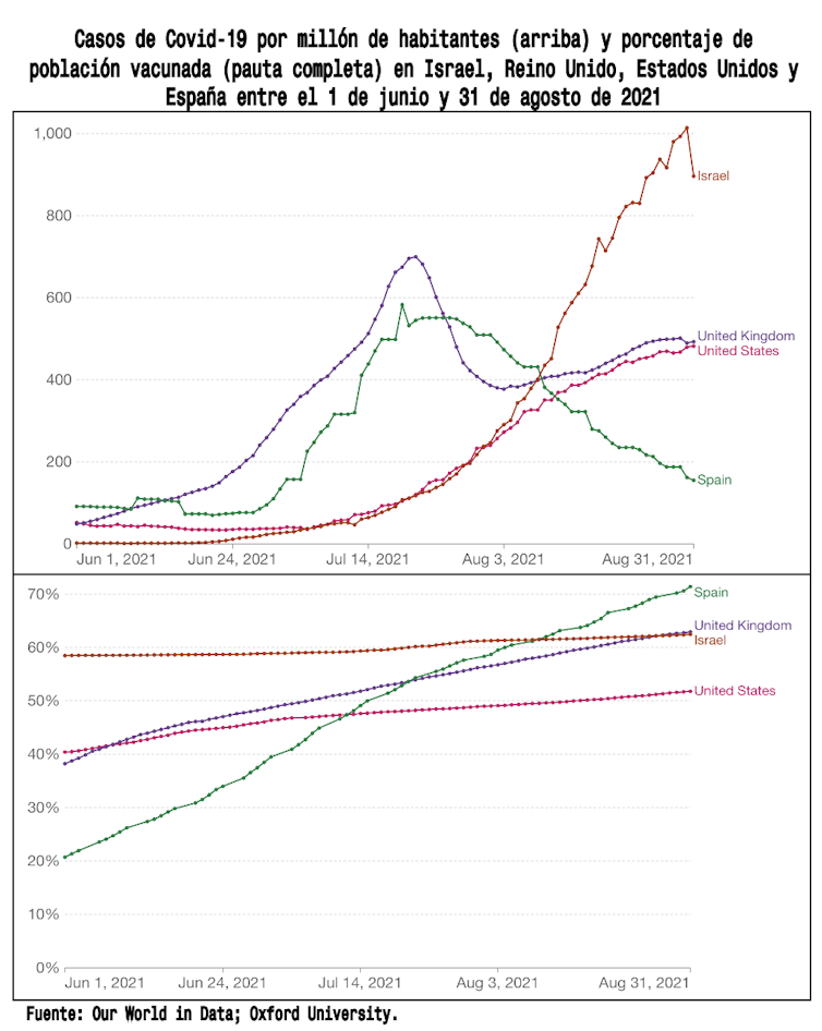 Tampoco evitó la subsiguiente decepción cuando países con porcentajes de vacunación elevados (especialmente Israel, ver figura 1) experimentaron durante este verano importantes repuntes en la transmisión a pesar de haberse acercado a la citada cifra.