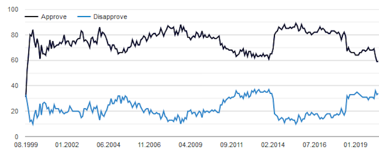 Sus tasas de aprobación comenzaron a caer en 2018 tras la reforma de la pensiones, el persistente bajo crecimiento económico, y los altos gastos militares ocasionados por los conflictos en Ucrania y Siria.