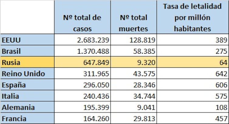 La pandemia llegó a Rusia relativamente tarde en comparación con Europa occidental, pero desde finales de abril el número de casos se ha disparado y actualmente es el tercer país con mayor número de infectados. Sin embargo, la mortalidad por millón de habitantes está muy por debajo de la de Europa occidental o América.