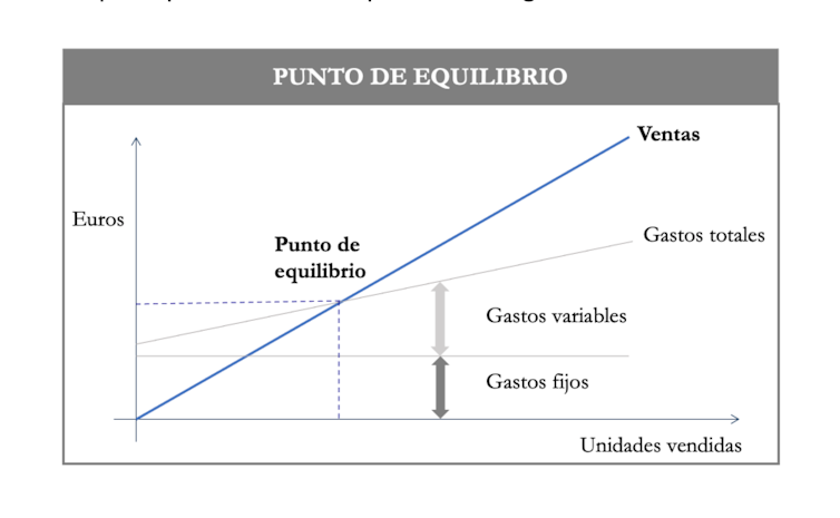 En el gráfico vemos que existe un nivel de gastos fijos que es independiente de las ventas y unos gastos variables que sí están directamente relacionados con éstas. Al sumar los gastos fijos y los variables se obtienen los gastos totales. El punto en el que se cruzan las ventas con los gastos totales es el punto de equilibrio.