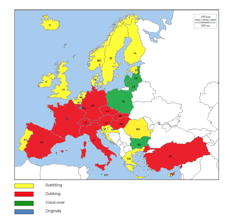 Esto queda reflejado en la comparación que Talaván establece de dos mapas de Europa. Uno de ellos proviene del informe Study on the Use of Subtitling, realizado a petición de la UE, donde se presentan las prácticas de traducción audiovisual en la televisión de la mayoría de países europeos.