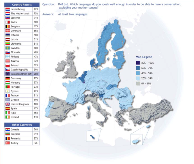 El otro mapa, tomado de Europeans and their Languages, ilustra el porcentaje de hablantes que reconoce poder mantener una conversación en al menos dos segundas lenguas.