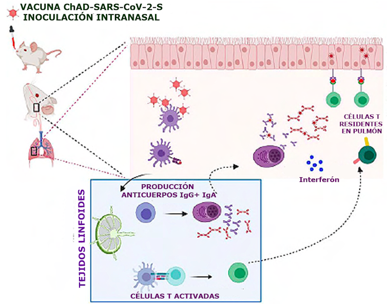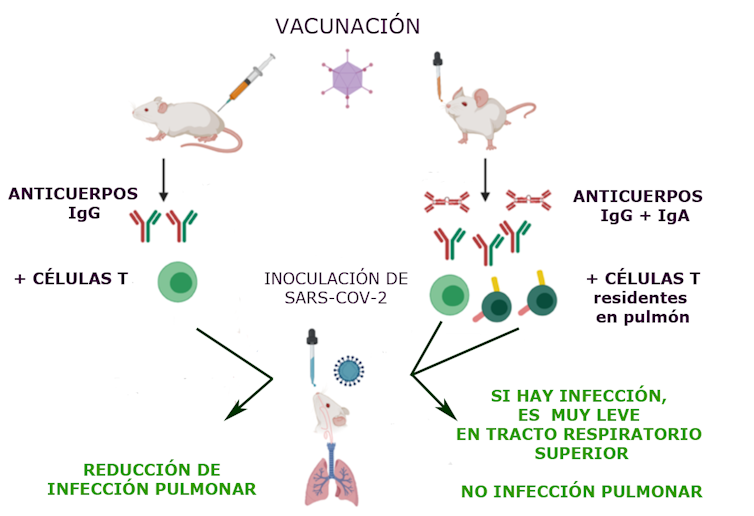 El efecto observado cambió radicalmente cuando aplicaron la vacuna de forma nasal. En ese caso detectaron anticuerpos de tipo IgG y de tipo IgA (anticuerpos típicos de la respuesta a nivel de mucosas), además de células T “residentes” en los pulmones. Se produjo la denominada “inmunidad de mucosa”, que puede ser mucho más protectora para infecciones respiratorias.
