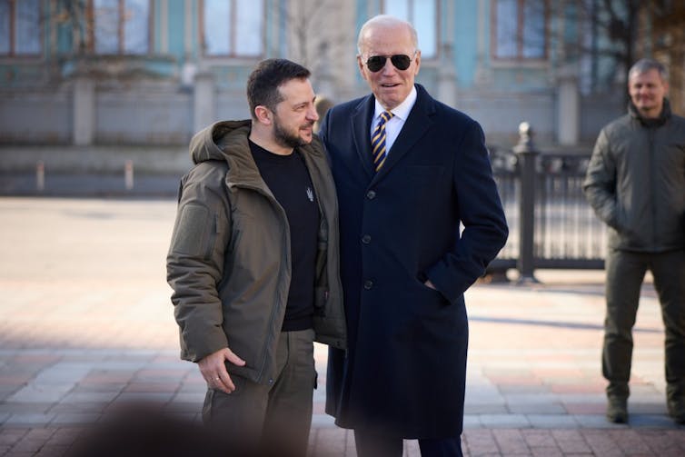 El presidente de Ucrania, Volodímir Zelenski, y el de Estados Unidos, Joe Biden, durante la visita de este último a Kiev el 20 de febrero de 2023. Presidencia de Ucrania